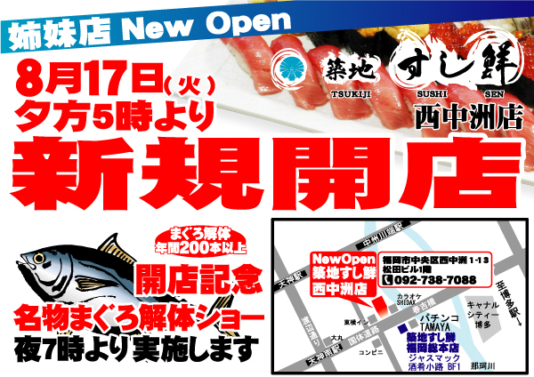 まぐろ解体ショー開催!!本日オープン致します『築地すし鮮』 西中洲店!新店オープンを記念いたしまして、19時より魚家グループ名物まぐろの解体ショーを開催致します!!その場で解体したまぐろが食べられます!!また、かま、目玉などの希少部位も調理いたします。 新店オープン時間は17時!お待ちしております!